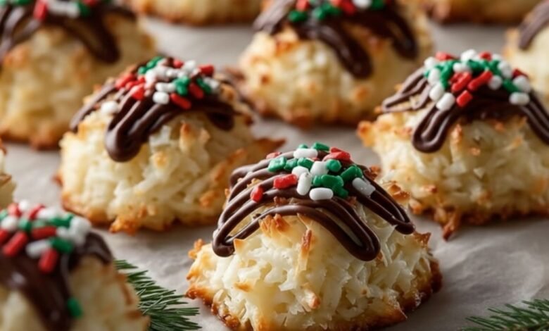 These Coconut Christmas Cookies are a cross between a macaroon and a classic drop cookie — soft on the inside, golden on the outside, and irresistibly rich. The shredded coconut provides natural sweetness and texture, while the chocolate drizzle adds a silky layer of decadence to every bite. A sprinkle of colorful holiday sprinkles completes the look, transforming each cookie into a tiny edible ornament perfect for the season.
