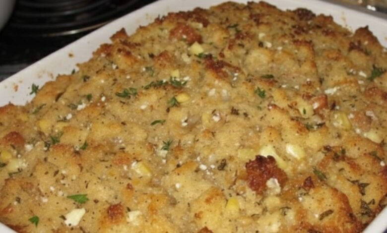 This version brings together tender cornbread, aromatic sautéed veggies, cozy herbs like sage and poultry seasoning, and plenty of chicken or turkey stock to keep everything moist and flavorful. It bakes up with a golden top and a soft, comforting interior that pairs perfectly with roasted turkey, chicken, ham, or even on its own with a little gravy.