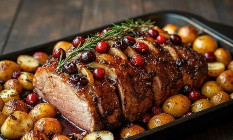 Remove the roast, tent loosely with foil, and rest for 10 minutes. This step is non-negotiable if you want juicy slices. Then slice and serve with the roasted potatoes, cranberries, and pan juices (plus any remaining glaze).