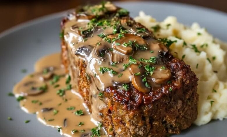 ⭐ Homemade Meatloaf Served with Rich and Creamy Mushroom Gravy
