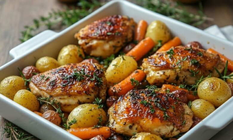 Honey Garlic Roasted Chicken Thighs with Potatoes & Carrots
