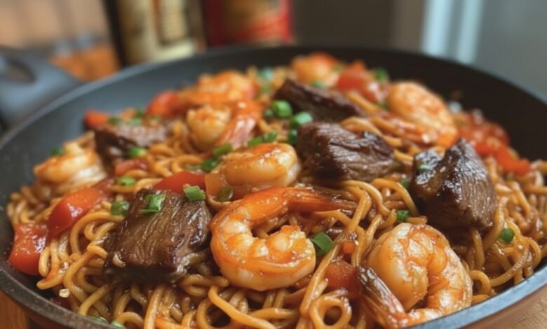 A sizzling combo of juicy steak, tender shrimp, stir-fried veggies, and glossy teriyaki noodles — all cooked in one pan! This dish is bursting with sweet-savory flavor and ready in under 30 minutes.
